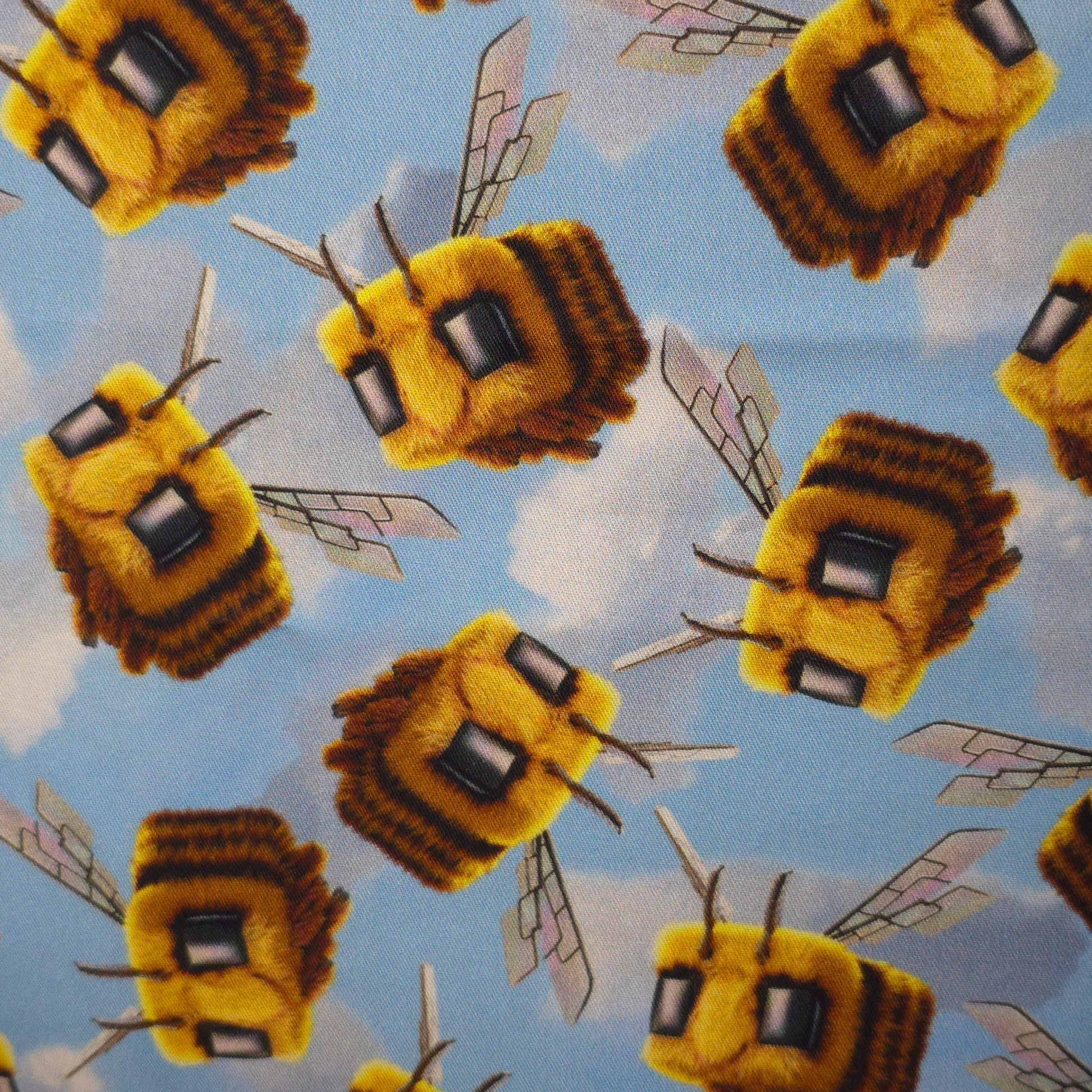This playful print features pixel-style bees inspired by Minecraft, buzzing across a bright blue sky with fluffy clouds. Perfect for fans of the game, this fun and vibrant design adds a touch of gamer charm to your handmade scrunchies, wristlets, lanyards, and more. A must-have for any Minecraft lover!