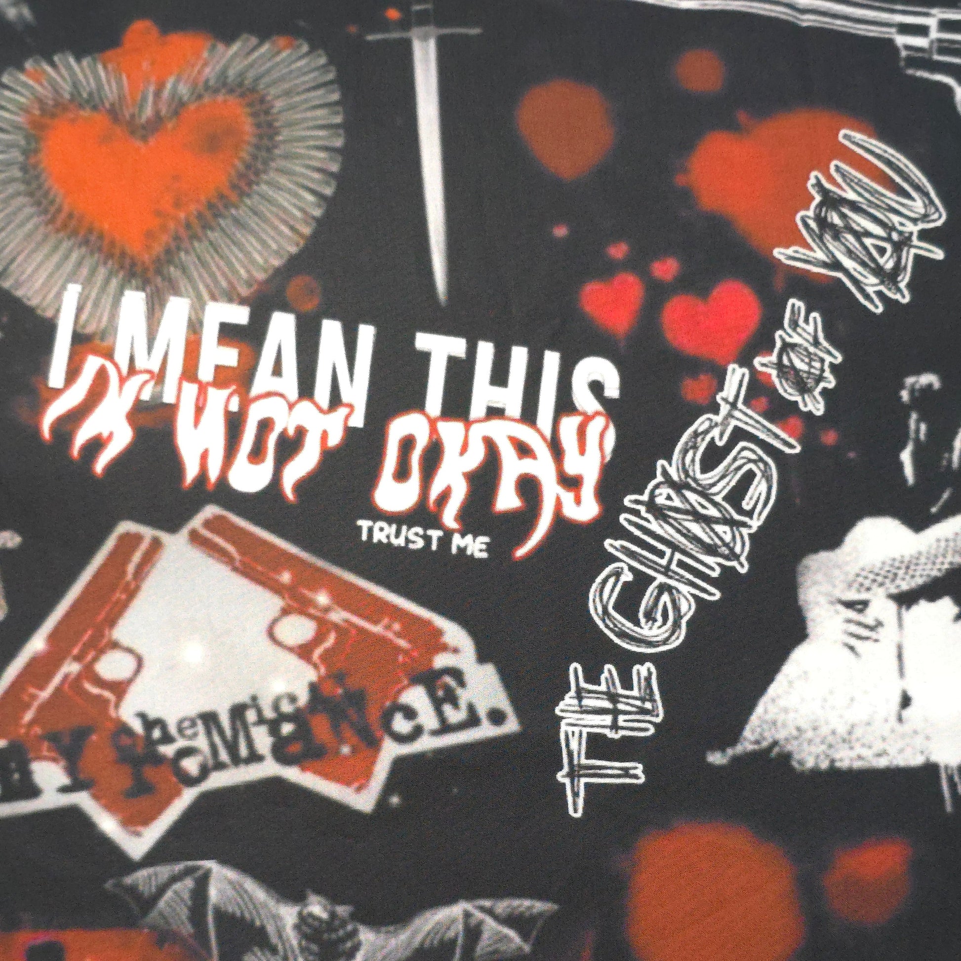 This product features a bold My Chemical Romance-inspired print, showcasing iconic references like “I’m Not Okay,” “The Ghost of You,” and classic MCR imagery including hearts, bats, and gothic motifs. A must-have for any MCR fan or emo aesthetic lover.