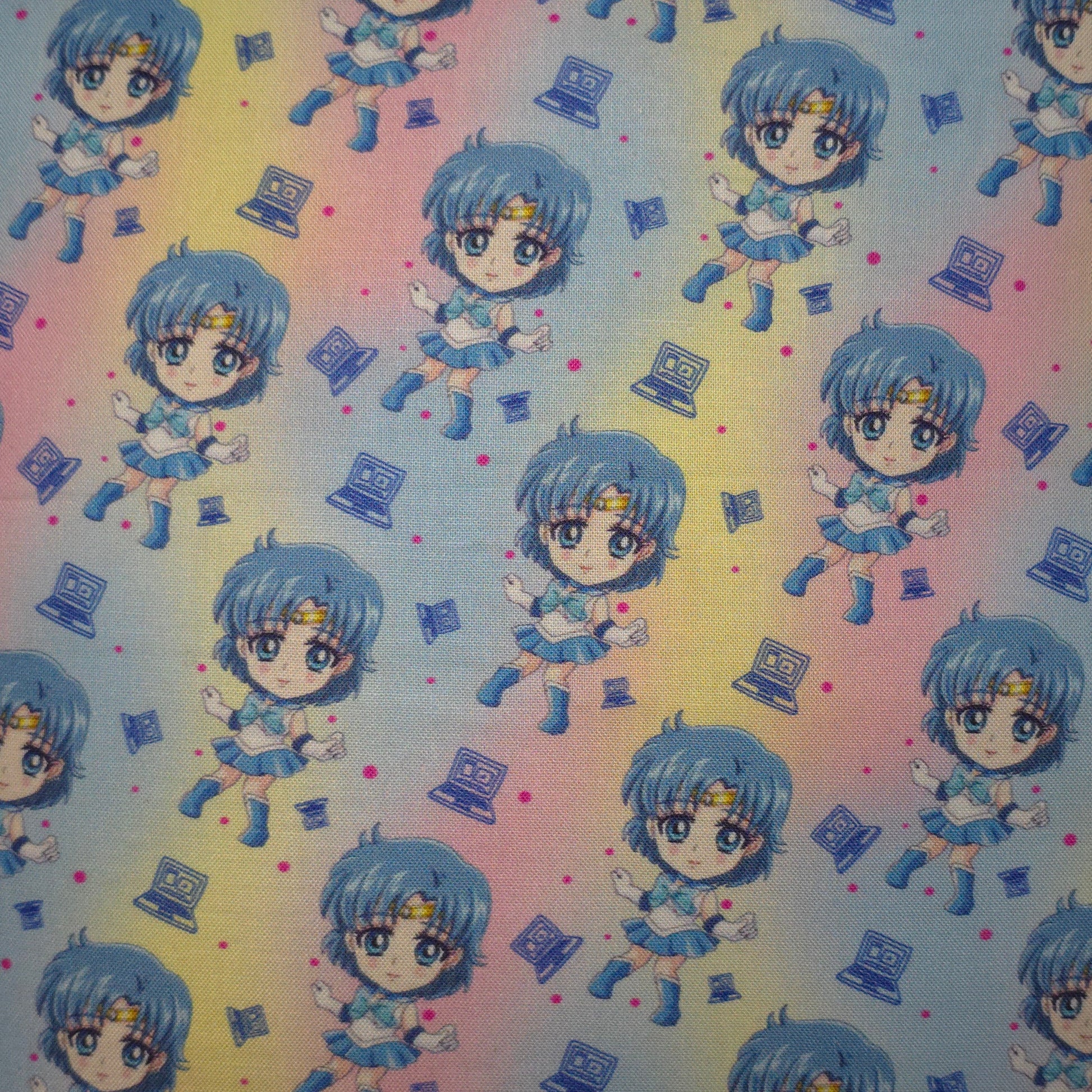 This fabric features a super cute Sailor Mercury (Ami Mizuno) inspired print from Sailor Moon, showcasing chibi-style artwork on a pastel rainbow background.
